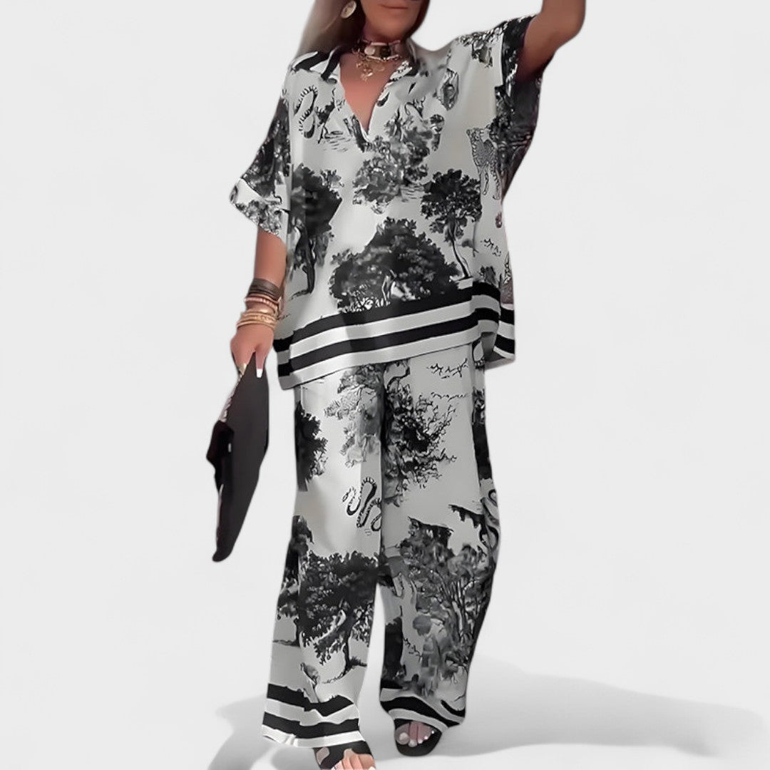 See elegantne ja voolav komplekt on kaasaegse rafineerituse ideaalne määratlus. Julge mustriga ja lõdva lõikega, pakub see muljetavaldavat välimust, ohverdamata mugavust. Olgu see erilise õhtusöögi, ürituse või igapäevaelu šikiks muutmiseks, see komplekt on õige valik neile, kes soovivad klassiga silma paista.