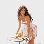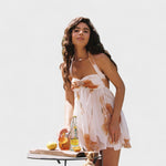Mini Lilled Kleid kiirgab puhtat romantikat – õrnade lilledega pastelltoonis, halter-kaelusega ja kergete šifoonkihtidega, mis langevad võluvalt. Täiuslik aedipidude, suvebrunchide või klaasi roosa veini nautimiseks päikese käes.
