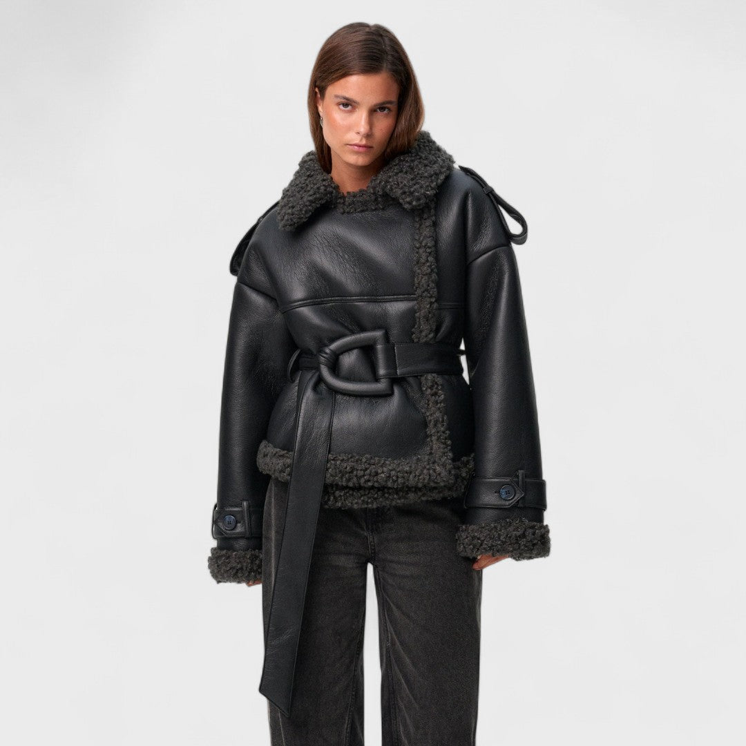 Sukeldu puhtasse rafineeritusesse selle elegantse lõikega lambanahkade jopega. Struktureeritud siluett ja vöö talje ümber tagavad meeldiva sobivuse, samas kui luksuslikud detailid ühendavad mugavuse ja elegantsi. Olgu need jalutuskäigud linnas või erilised sündmused, see rõivastus lisab igale riietusele stiili.