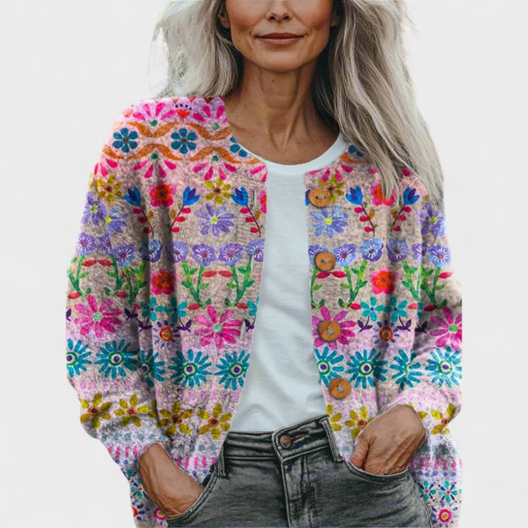Valmistatud pehmest polsterdatud kangast ja kaunistatud võluvate puidust nööbidega, see rõõmus kardigan ühendab soojust, stiili ja originaalsust silmapaistvas tükis. Täiuslik kanda T-särgi või pluusi peal tuulistel sügispäevadel või et end soojendada jahedatel õhtutel. Olgu sa siis lehtede seas jalutamas või nautimas kohvi terrassil.