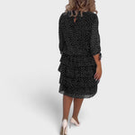 Kleit Clara kiirgab puhtaid elegantsi, millel on rafineeritud täppide muster. Kolmeveerandi varrukad ja ümar kaelus annavad klassikalise ilme, samas kui kihid loovad kauni langeva silueti.