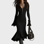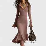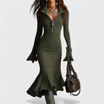 Elegantne kleit Laura on loodud, et rõhutada figuuri ajatu klassiga. Valmistatud pehmest ja ümbritsevast kangast, järgib see harmooniliselt keha jooni, pakkudes mugavust ja stiili ühes tükis. Ees oleva lukuga ja kergelt laienev lõige annab liikumist ja rafineeritud ilme, mis sobib ideaalselt igaks juhuks — päevast õhtuni.